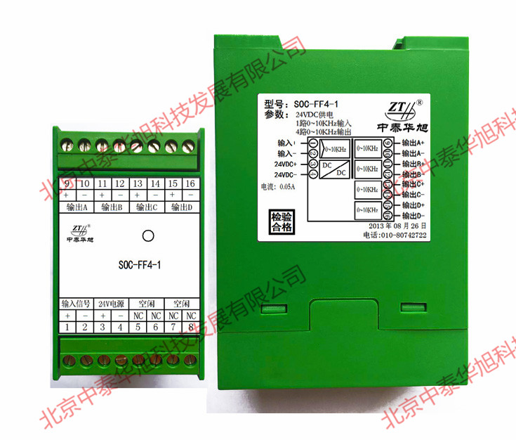 脉冲信号分配器,也称为频率信号分配器SOC-FF4-1是中泰华旭自己研发、生产、销售,基于工控级的一款标准一入四出份配器,一路脉冲信号0-10KHZ输入,四路0-10KHZ输出,工作电压为24VDC.